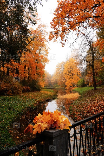 Сентябрьский осенний парк в России, озеро с красными листьями и отражением в густом тумане. Красивый осенний пейзаж в парке, времена года., Путешествие по красивым, русским, осенним лесам