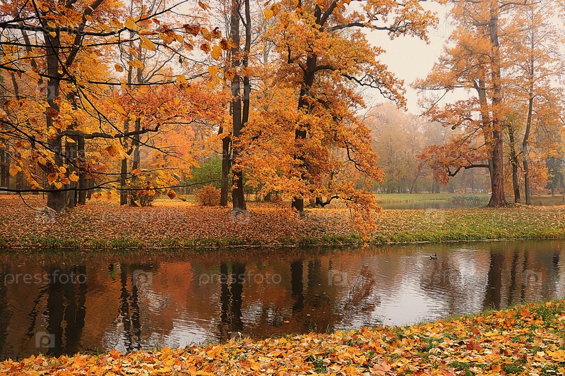 Осенний парк в сентябре, тропа с красными листьями в густом тумане. Красивый осенний пейзаж в парке, времена года