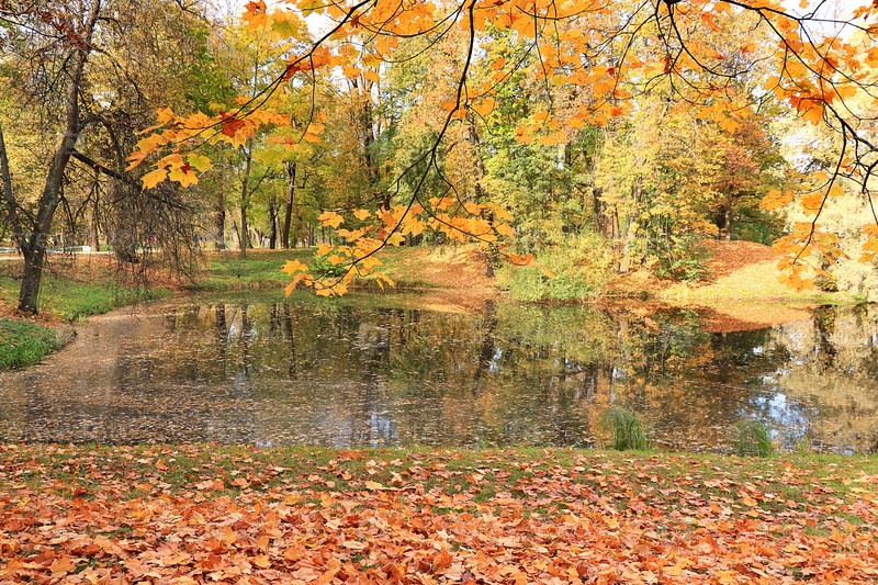 Октябрьский осенний парк в России, озеро с красными листьями и отражением в озере, Александровский парк, Царское Село, Ленинградская область. Осенний пейзаж, времена года