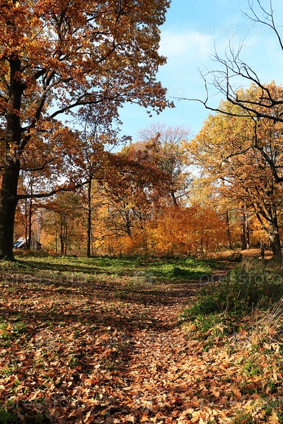 Солнечная осень в России. Тропа с падающими кленовыми листьями в лесу в сентябрьский день