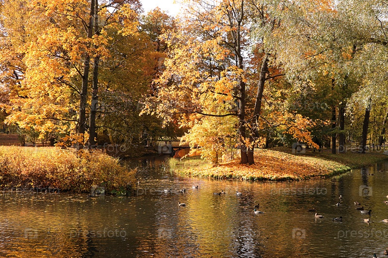 Осенний парк в сентябре, тропа с красными листьями в густом тумане. Красивый осенний пейзаж в парке, времена года
