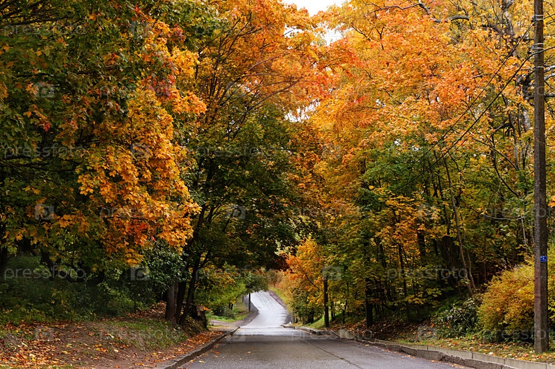 Осенняя дорога в России, тропа среди красных и желтых деревьев в лесу. Красота сентябрьского леса