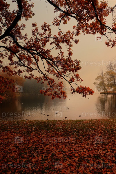 Сентябрьский осенний парк в России, озеро с красными листьями и отражением в густом тумане. Красивый осенний пейзаж в парке, времена года., Путешествие по красивым, русским, осенним лесам