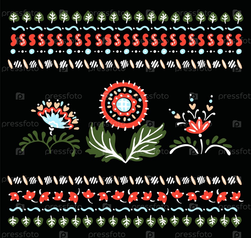 Набор этнических элементов. Бордюр представляет собой полосу с цветами, листьями, ветками, вензелями. Народная вышивка. Славянский, украинский, русский мотив. Хохлома, матрешка, дымковская игрушка. Мексиканский, индийский, цыганский ковер. Вязаное кружево