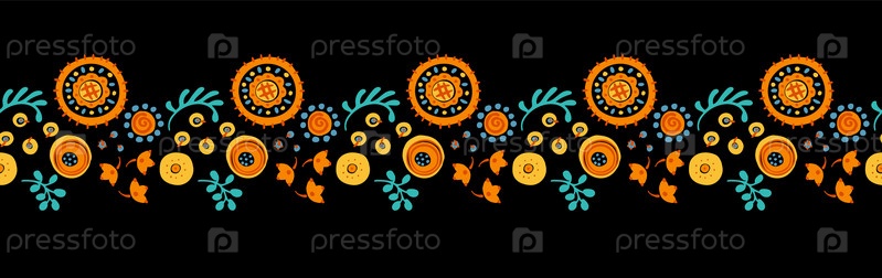 Набор этнических элементов. Бордюр представляет собой полосу с цветами, листьями, ветками, вензелями. Народная вышивка. Славянский, украинский, русский мотив. Хохлома, матрешка, дымковская игрушка. Мексиканский, индийский, цыганский ковер. Вязаное кружево