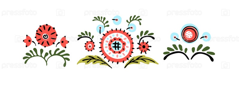 Набор этнических элементов. Бордюр представляет собой полосу с цветами, листьями, ветками, вензелями. Народная вышивка. Славянский, украинский, русский мотив. Хохлома, матрешка, дымковская игрушка. Мексиканский, индийский, цыганский ковер. Вязаное кружево