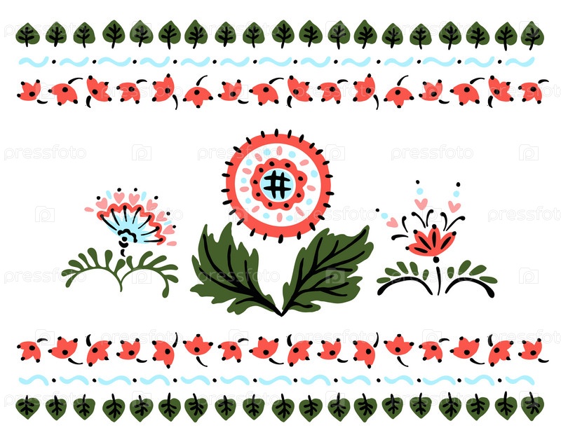 Набор этнических элементов. Бордюр представляет собой полосу с цветами, листьями, ветками, вензелями. Народная вышивка. Славянский, украинский, русский мотив. Хохлома, матрешка, дымковская игрушка. Мексиканский, индийский, цыганский ковер. Вязаное кружево