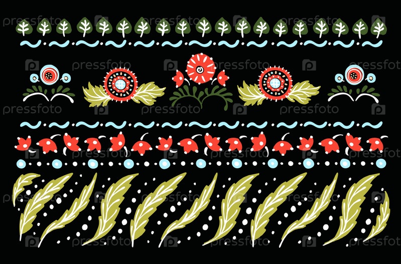 Набор этнических элементов. Бордюр представляет собой полосу с цветами, листьями, ветками, вензелями. Народная вышивка. Славянский, украинский, русский мотив. Хохлома, матрешка, дымковская игрушка. Мексиканский, индийский, цыганский ковер. Вязаное кружево