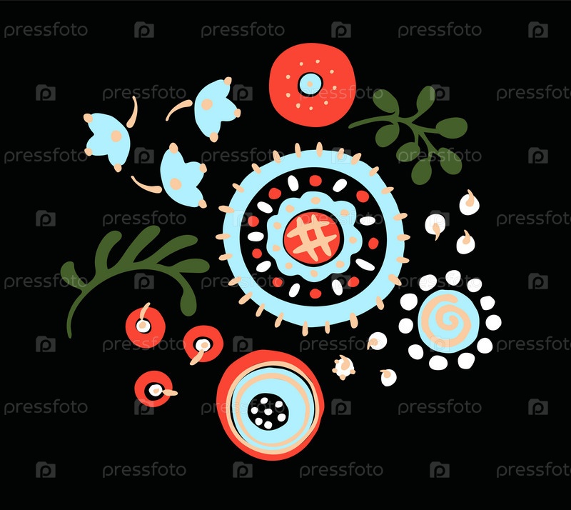 Набор этнических элементов. Бордюр представляет собой полосу с цветами, листьями, ветками, вензелями. Народная вышивка. Славянский, украинский, русский мотив. Хохлома, матрешка, дымковская игрушка. Мексиканский, индийский, цыганский ковер. Вязаное кружево