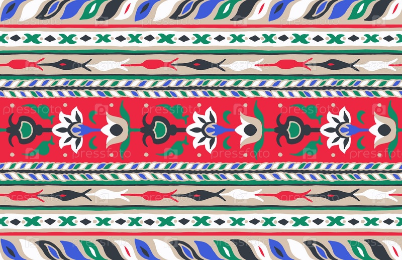 Набор этнических элементов. Бордюр представляет собой полосу с цветами, листьями, ветками, вензелями. Народная вышивка. Славянский, украинский, русский мотив. Хохлома, матрешка, дымковская игрушка. Мексиканский, индийский, цыганский ковер. Вязаное кружево