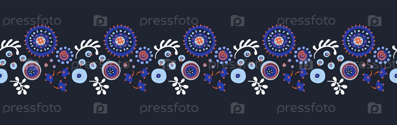 Набор этнических элементов. Бордюр представляет собой полосу с цветами, листьями, ветками, вензелями. Народная вышивка. Славянский, украинский, русский мотив. Хохлома, матрешка, дымковская игрушка. Мексиканский, индийский, цыганский ковер. Вязаное кружево