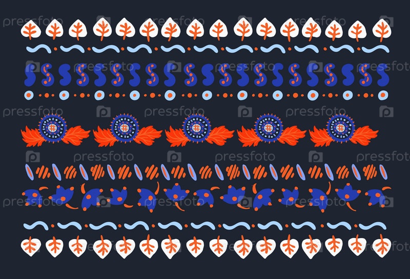 Набор этнических элементов. Бордюр представляет собой полосу с цветами, листьями, ветками, вензелями. Народная вышивка. Славянский, украинский, русский мотив. Хохлома, матрешка, дымковская игрушка. Мексиканский, индийский, цыганский ковер. Вязаное кружево