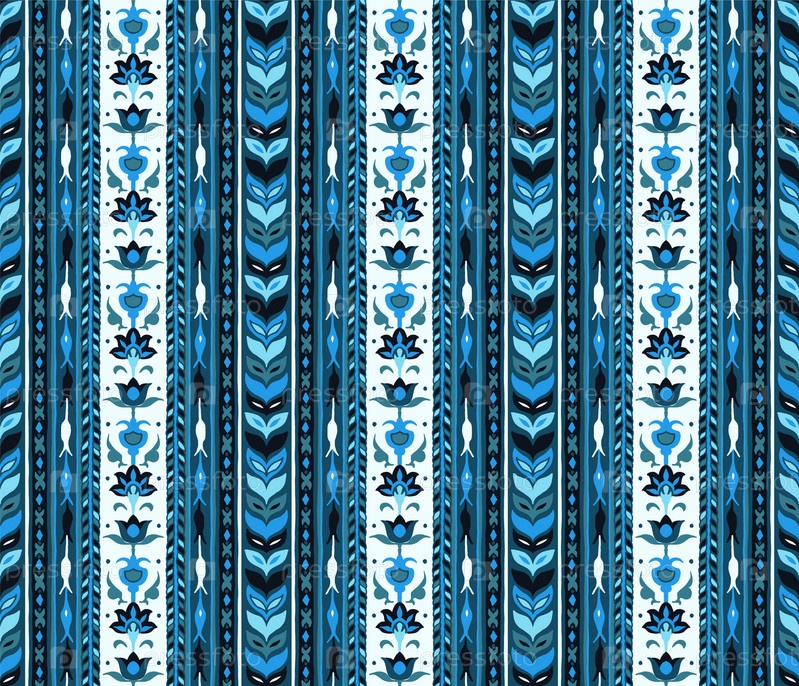 Геометрический дамасский орнамент. Икат границы. Этническая вышивка с листьями и монограммами. Племенная векторная текстура. Бесшовный народный узор в ацтекском стиле. Индийский, скандинавский, цыганский, мексиканский, африканский ковер