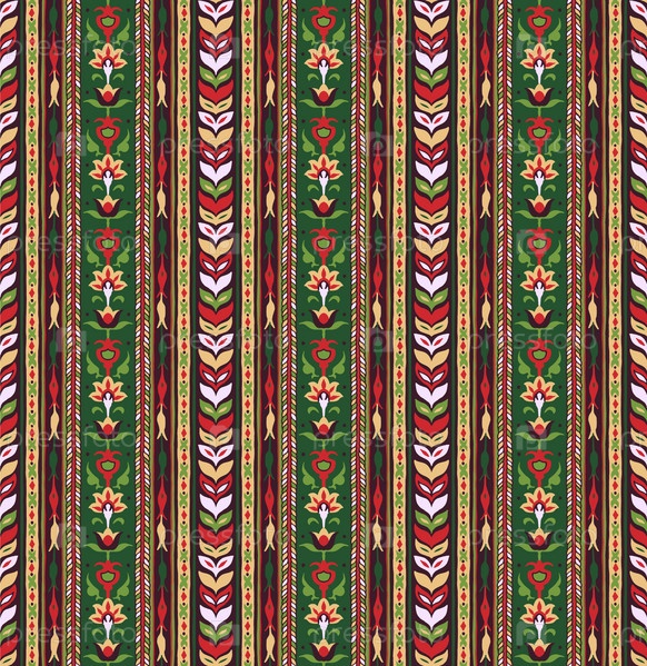 Геометрический дамасский орнамент. Икат границы. Этническая вышивка с листьями и монограммами. Племенная векторная текстура. Бесшовный народный узор в ацтекском стиле. Индийский, скандинавский, цыганский, мексиканский, африканский ковер