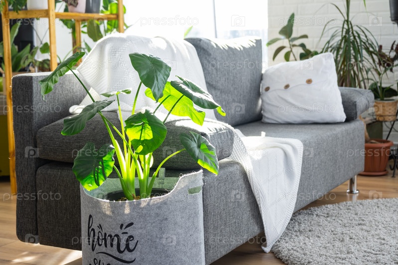 Серый современный диван с белым пледом в интерьере в стиле лофт и зеленый домик с растениями в горшках. Уютная светлая комната, ковер, гостиная