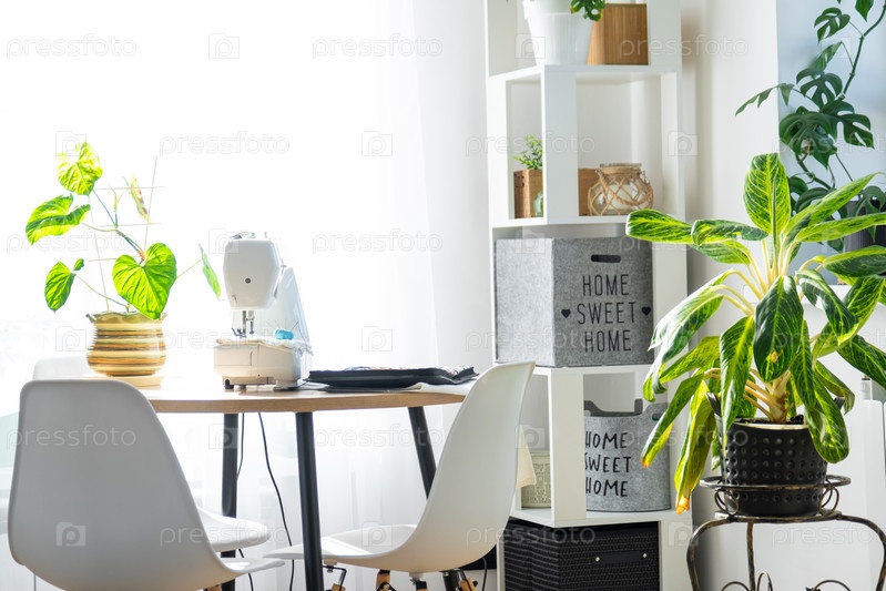 Швейная машинка на круглом столе в белом интерьере дома у окна с прозрачной занавеской и домашнее растение в горшке - современный интерьер. хобби, домашний бизнес