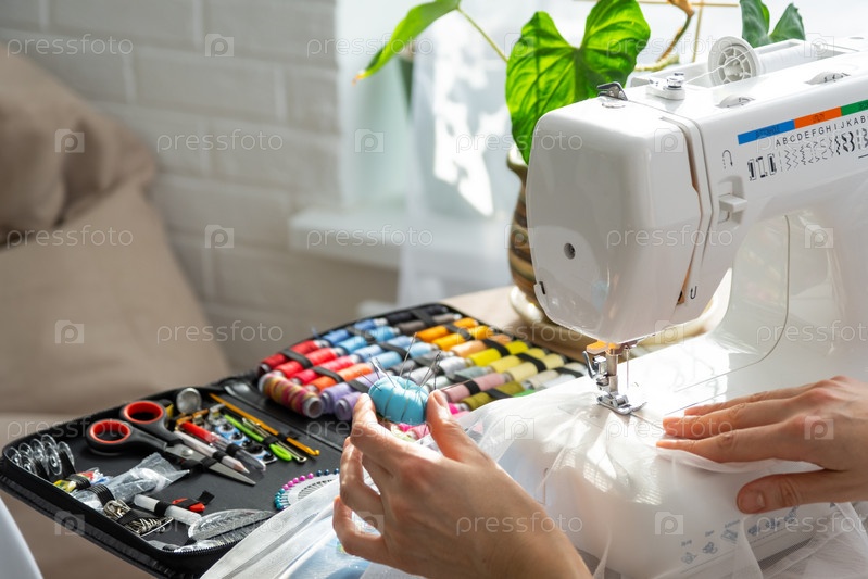 Рука женщины крупным планом шьет тюль на электрической швейной машине. Заправляя нить в иглу, регулируя натяжение. Уют в доме, хобби домохозяйки, раскладка швейных инструментов