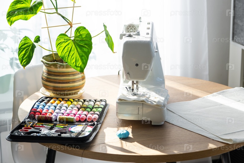 Схема шитья с разноцветными катушками ниток крупным планом, иглами, электрической швейной машиной. Заправляя нить в иглу, регулируя натяжение. хобби, домашний бизнес