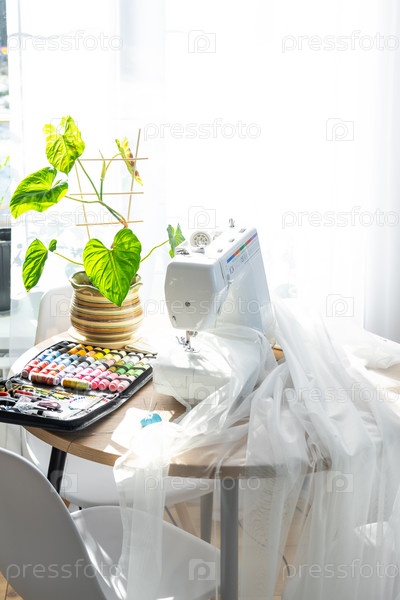 Схема шитья с разноцветными катушками ниток крупным планом, иглами, электрической швейной машиной. Заправляя нить в иглу, регулируя натяжение. хобби, домашний бизнес