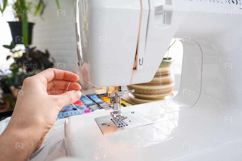 Рука женщины крупным планом шьет тюль на электрической швейной машине. Заправляя нить в иглу, регулируя натяжение. Уют в доме, хобби домохозяйки, раскладка швейных инструментов