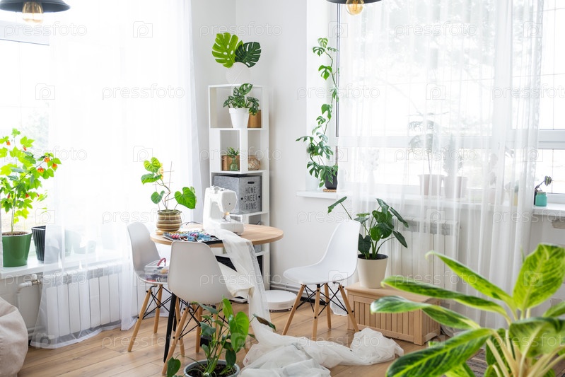 Швейная машинка на круглом столе в белом интерьере дома у окна с прозрачной занавеской и домашнее растение в горшке - современный интерьер. хобби, домашний бизнес