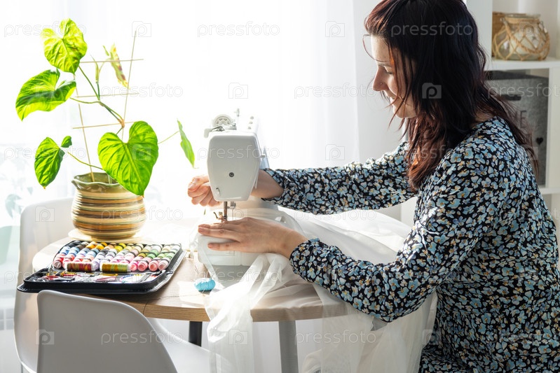 Женщина шьет тюль на электрической швейной машине в белом современном интерьере дома с большими окнами, комнатными растениями. Уют в доме, хобби домохозяйки
