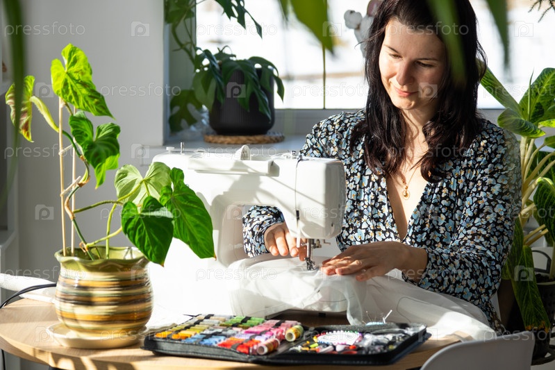 Женщина шьет тюль на электрической швейной машине в белом современном интерьере дома с большими окнами, комнатными растениями. Уют в доме, хобби домохозяйки