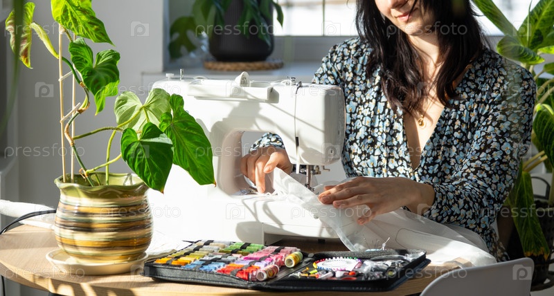 Женщина шьет тюль на электрической швейной машине в белом современном интерьере дома с большими окнами, комнатными растениями. Уют в доме, хобби домохозяйки