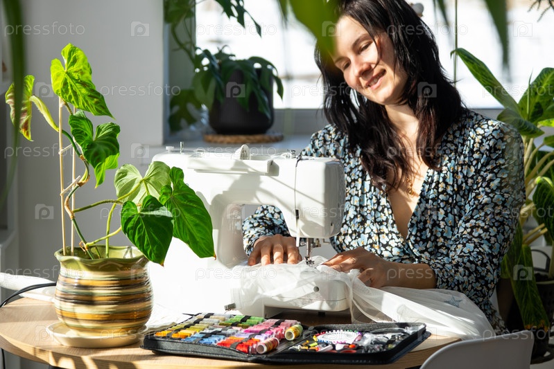 Женщина шьет тюль на электрической швейной машине в белом современном интерьере дома с большими окнами, комнатными растениями. Уют в доме, хобби домохозяйки