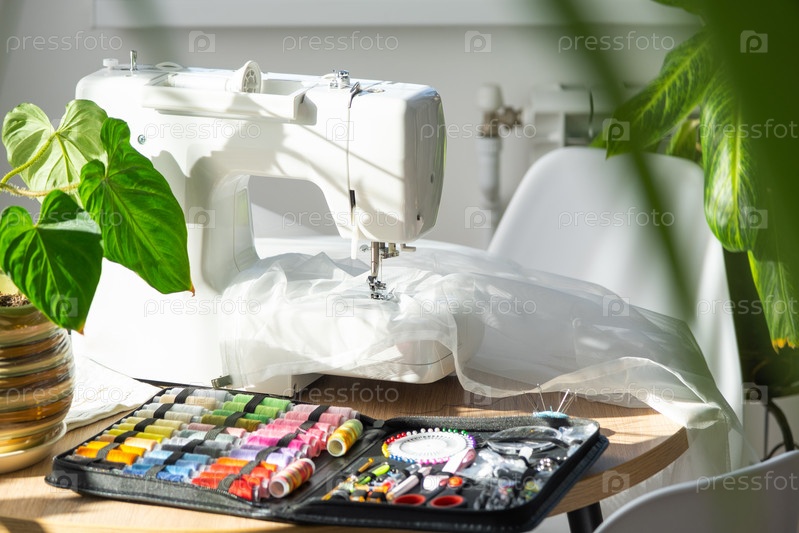 Схема шитья с разноцветными катушками ниток крупным планом, иглами, электрической швейной машиной. Заправляя нить в иглу, регулируя натяжение. хобби, домашний бизнес