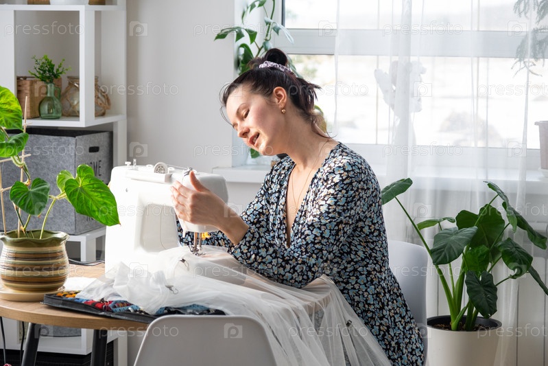 Женщина шьет тюль на электрической швейной машине в белом современном интерьере дома с большими окнами, комнатными растениями. Уют в доме, хобби домохозяйки