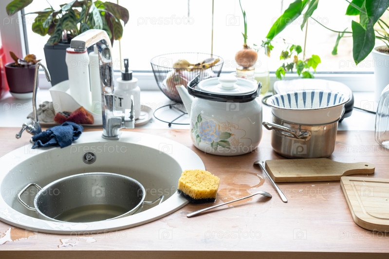 Беспорядок на кухне, грязная посуда на столе, разбросанные вещи, антисанитария. кухня неопрятная, повседневная жизнь