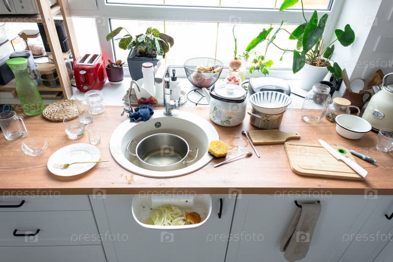 Беспорядок на кухне, грязная посуда на столе, разбросанные вещи, антисанитария. кухня неопрятная, повседневная жизнь