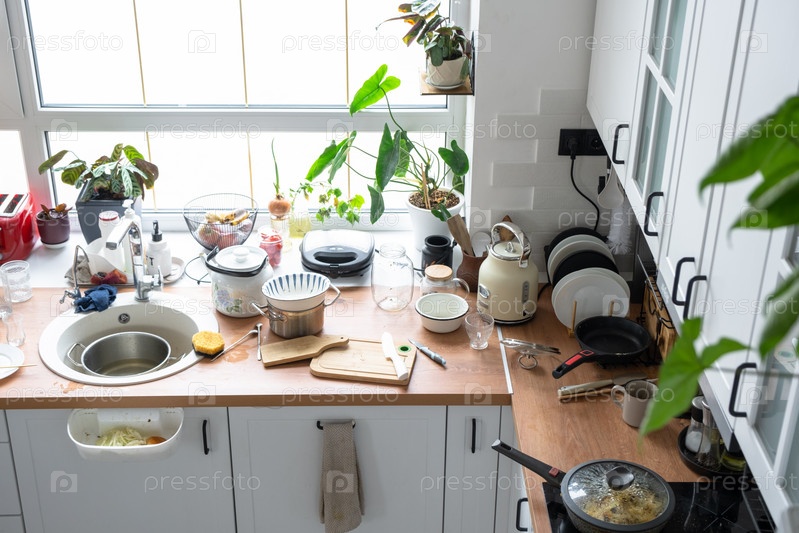 Беспорядок на кухне, грязная посуда на столе, разбросанные вещи, антисанитария. кухня неопрятная, повседневная жизнь
