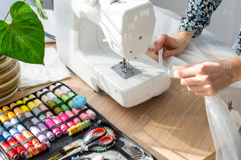 Рука женщины крупным планом шьет тюль на электрической швейной машине. Заправляя нить в иглу, регулируя натяжение. Уют в доме, хобби домохозяйки, раскладка швейных инструментов