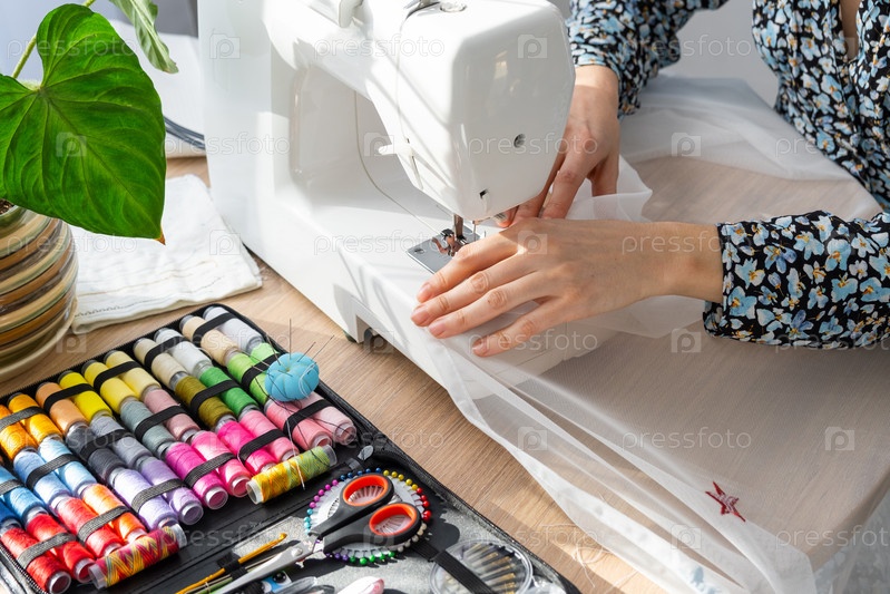 Рука женщины крупным планом шьет тюль на электрической швейной машине. Заправляя нить в иглу, регулируя натяжение. Уют в доме, хобби домохозяйки, раскладка швейных инструментов