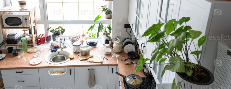 Беспорядок на кухне, грязная посуда на столе, разбросанные вещи, антисанитария. кухня неопрятная, повседневная жизнь
