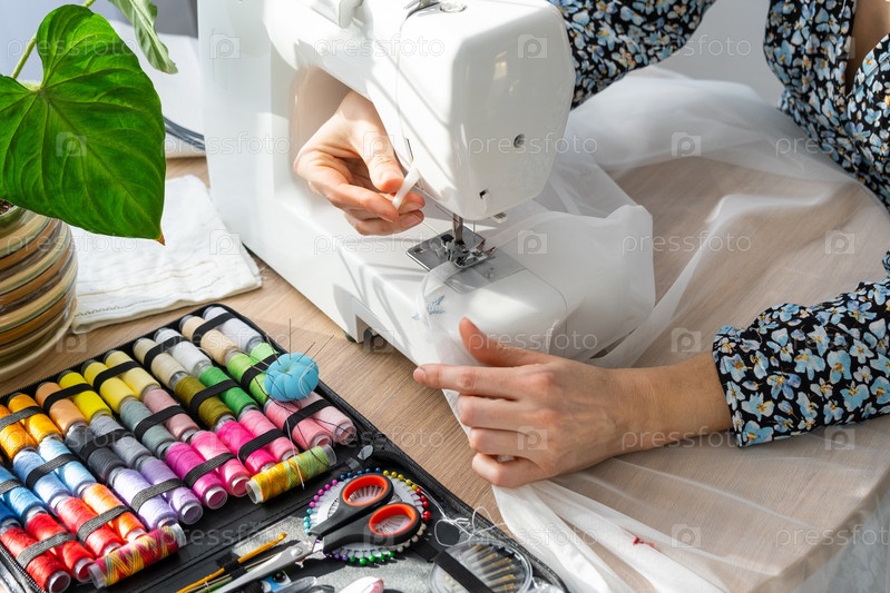 Рука женщины крупным планом шьет тюль на электрической швейной машине. Заправляя нить в иглу, регулируя натяжение. Уют в доме, хобби домохозяйки, раскладка швейных инструментов