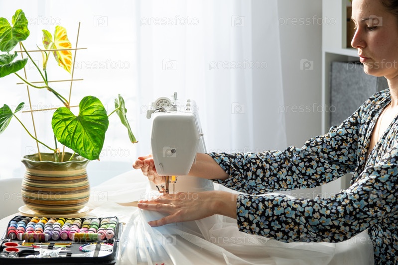 Женщина шьет тюль на электрической швейной машине в белом современном интерьере дома с большими окнами, комнатными растениями. Уют в доме, хобби домохозяйки