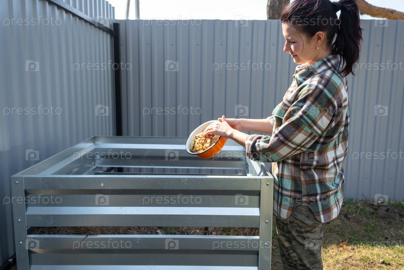 Женщина в клетчатой рубашке высыпает пищевые отходы из миски в компостную кучу из картофельных и морковных очистков. Компостный ящик из металла, экологически чистое удобрение для сада