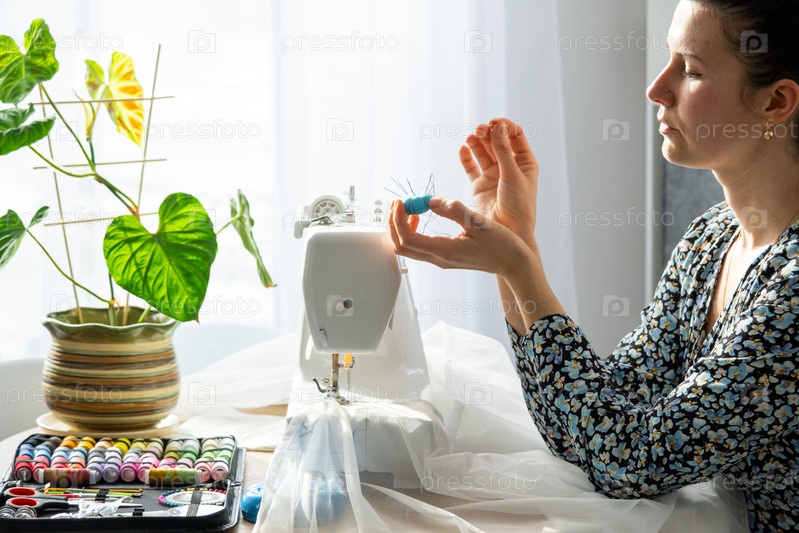 Женщина шьет тюль на электрической швейной машине в белом современном интерьере дома с большими окнами, комнатными растениями. Уют в доме, хобби домохозяйки
