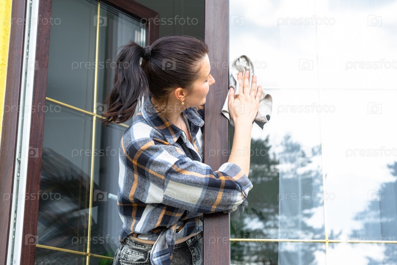 Женщина вручную моет окно дома тряпкой со спреем и шваброй снаружи. Безопасность на высоте, наведение порядка и чистоты весной, клининговые услуги