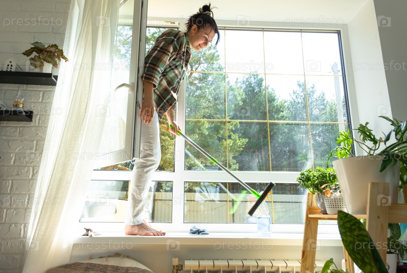 Женщина вручную моет окно дома тряпкой со спреем и шваброй внутри с белыми занавесками. Наведение порядка и чистоты весной, клининговые услуги