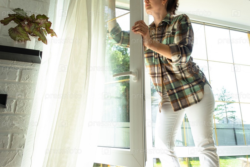 Женщина вручную моет окно дома тряпкой со спреем и шваброй внутри с белыми занавесками. Наведение порядка и чистоты весной, клининговые услуги