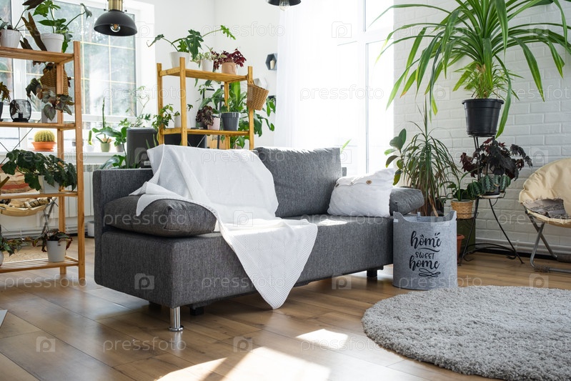 Серый современный диван с белым пледом в интерьере в стиле лофт и зеленый домик с растениями в горшках. Уютная светлая комната, ковер, гостиная