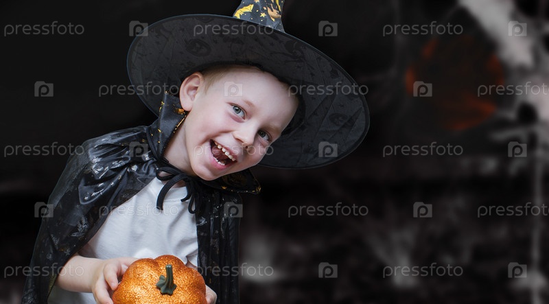 Портрет мальчика в костюме Хэллоуина на темном фоне. Счастливого Хэллоуина. Карнавал. Баннер. Копировать пространство