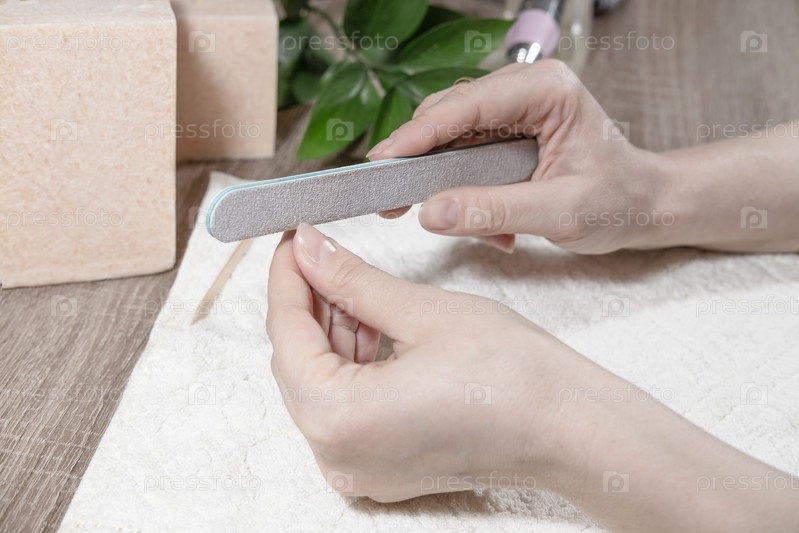 Женщина-маникюрша обрабатывает ногти пилочкой для ногтей, полирует поверхность ногтя, сглаживает форму ногтя в салоне красоты. Процесс маникюра крупным планом
