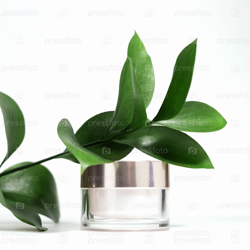 Макет белой банки крема на бело-сером фоне, на белом столе с зелеными листьями тропического растения, с жесткими тенями. Стильный внешний вид продукта, индивидуальность