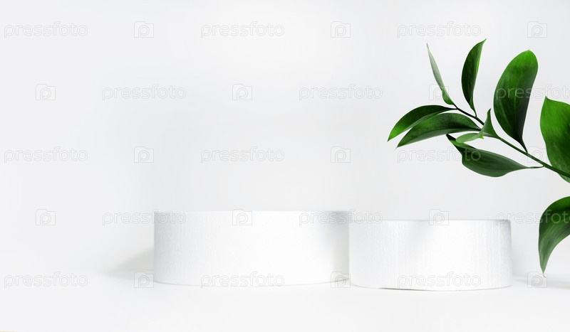 Цилиндрический подиум на белом фоне с жесткими тенями и листьями. Минимальная пустая сцена презентации косметических продуктов. Геометрический подиум