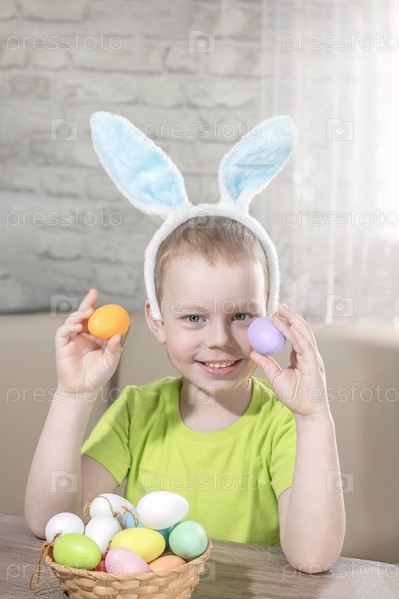 Пасхальные дети. Счастливый мальчик с кроличьими ушами на голове играет дома с крашеными яйцами. Подготовка к Пасхе Большая охота за яйцами. Пасхальный заяц. Пасхальные яйца. Вертикальное фото